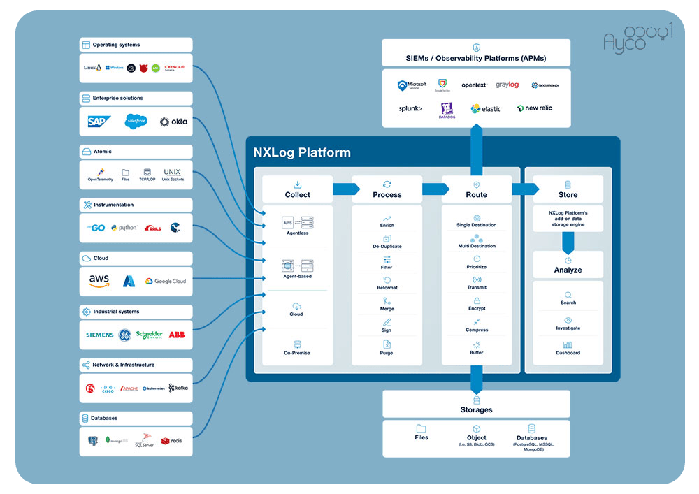 مدیریت لاگ NXLog با یک Agent واحد می‌تواند داده‌ها را از هر منبعی (سیستم‌های ویندوزی، لینوکسی یا ابری) جمع‌آوری کند و آن‌ها را به هر مقصدی از جمله SIEM ،APM یا پلتفرم‌های Observability ارسال کند.